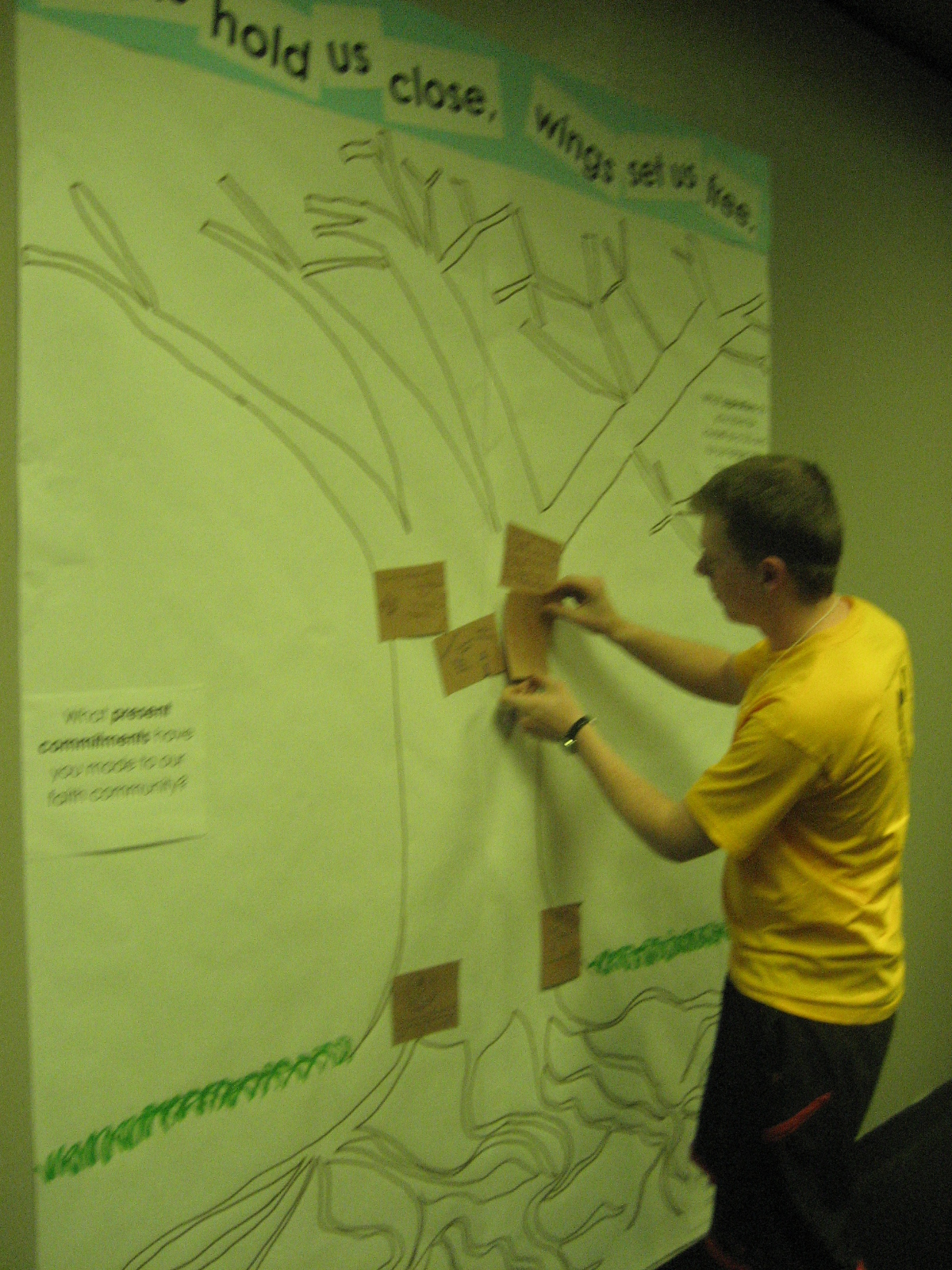 WEDNESDAY – Finally, the big day had arrived. I spent most of the morning watching highlights of Game 6 on ESPN in the hotel room but around midday it was time for Young Adult Orientation. It’s always such a pleasure hanging with the YAs and especially hearing from the amazing YA leaders within our faith. These folks are not the future—they are the present. They’re not standing around waiting for the establishment to hand them the reigns of Unitarian Universalism or pass the torch or whatever other idiom one might use. They are asserting their voices within our faith, voices of progressive change screaming to be heard by ears weathered by years of polity and justice work. The conversations, connections, and community I share each year at GA with these folks are, truly, the Roots that hold me close and the Wings that set me free. More on that later. One of the most interesting things about the YA Caucus room was this awesomely creative art project the staff put together. At Orientation, they passed out brown strips of paper and markers for folks to draw a visual representation of the congregation they’re from and write a sentence about what has brought them to General Assembly this year or what present commitments they have made to our faith community.