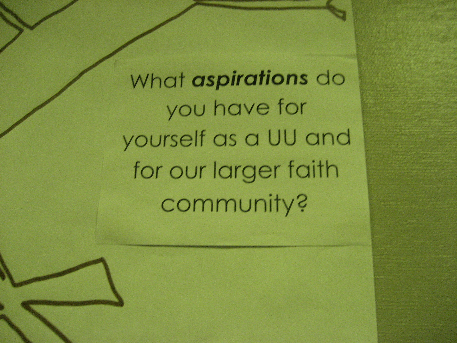 From Left to Right: “What roots do you have with Unitarian Universalism, or with another faith community?” “What present commitments have you made to our faith community?” “What aspirations do you have for yourself as a UU and for our larger faith community?”
