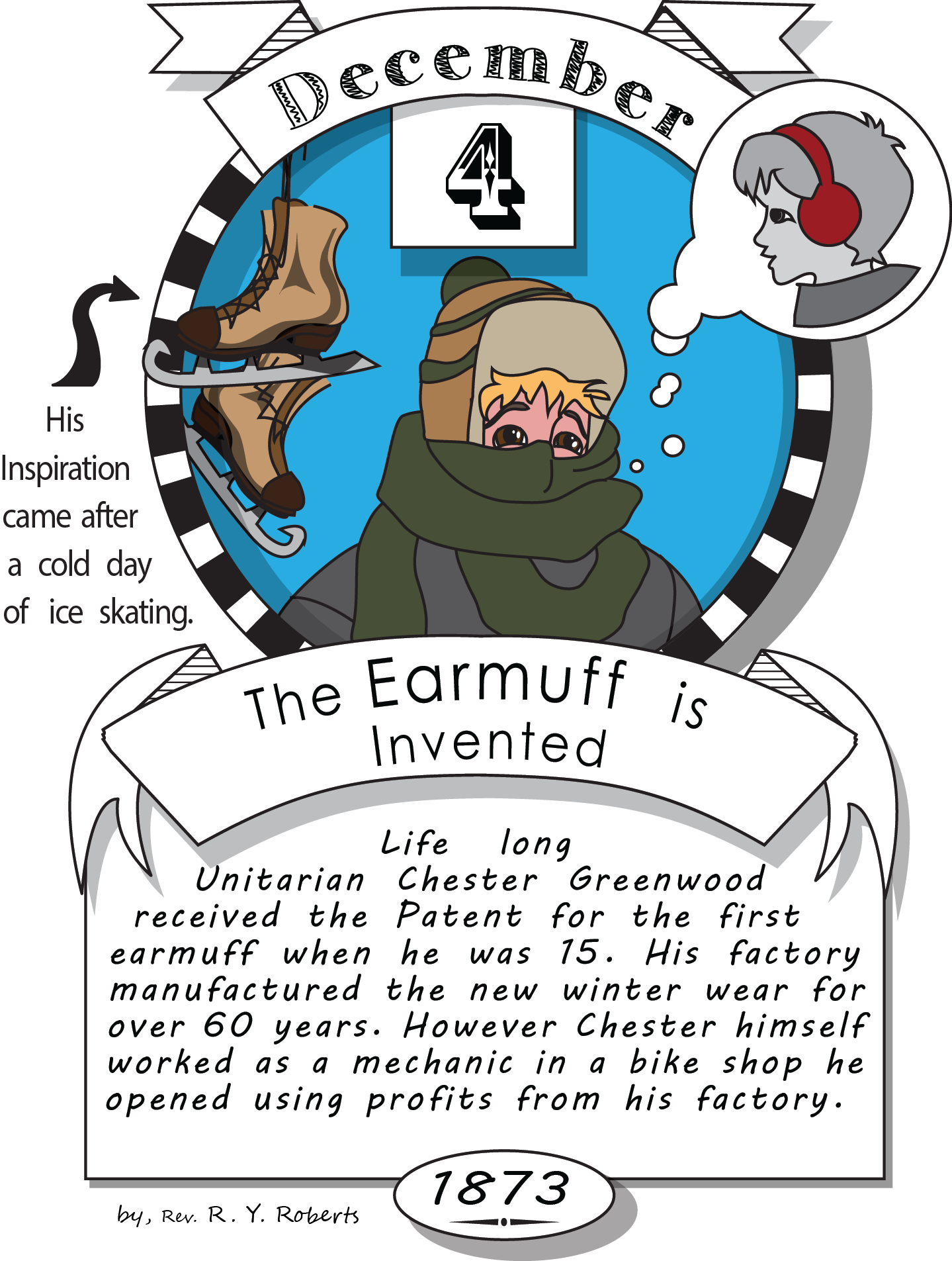 December fourth, the earmuff is invented (1873). Lifelong Unitarian Chester Greenwood received the Patent for the first earmuff when he was 15. His factory manufactured the new winter wear for over 60 years. However, Chester himself worked as a mechanic in a bike shop he opened using profits from his factory. By Rev. R. Y. Roberts